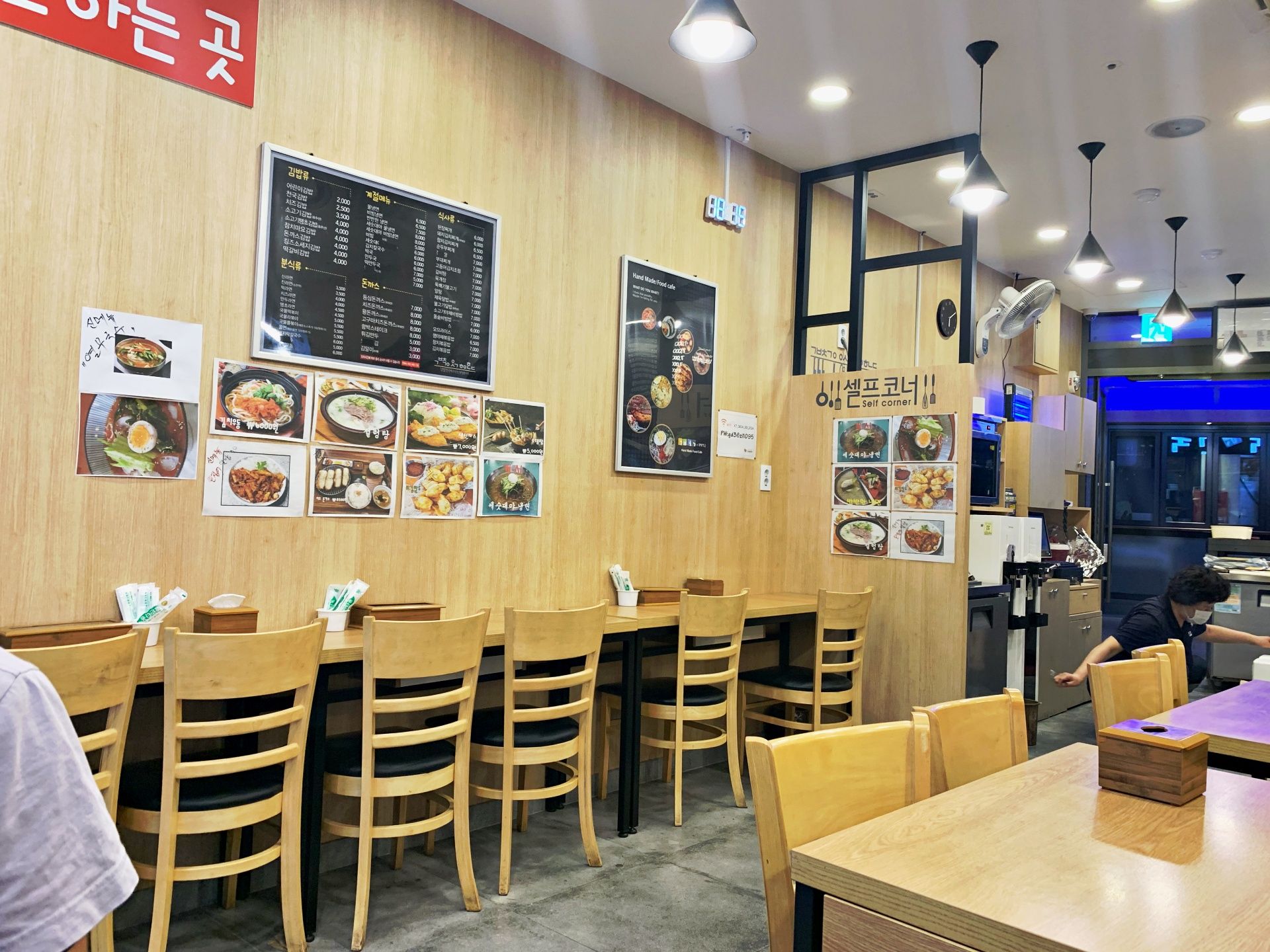 내부도 많이 변화했어요. 예전의 김밥천국이 아닙니다. 전에는 분식점 같은 느낌이였다면, 지금은 고급분식집의 인테리어를 가지고 있습니다. 웬만한 음식점들보다 나은 디자인으로 깔끔하기까지 합니다. 여러분들도 기억하시죠? 학교근처나 동네에 김밥천국 주황색 간판과 레트로했던 벽지들까지 기억하시겠죠.