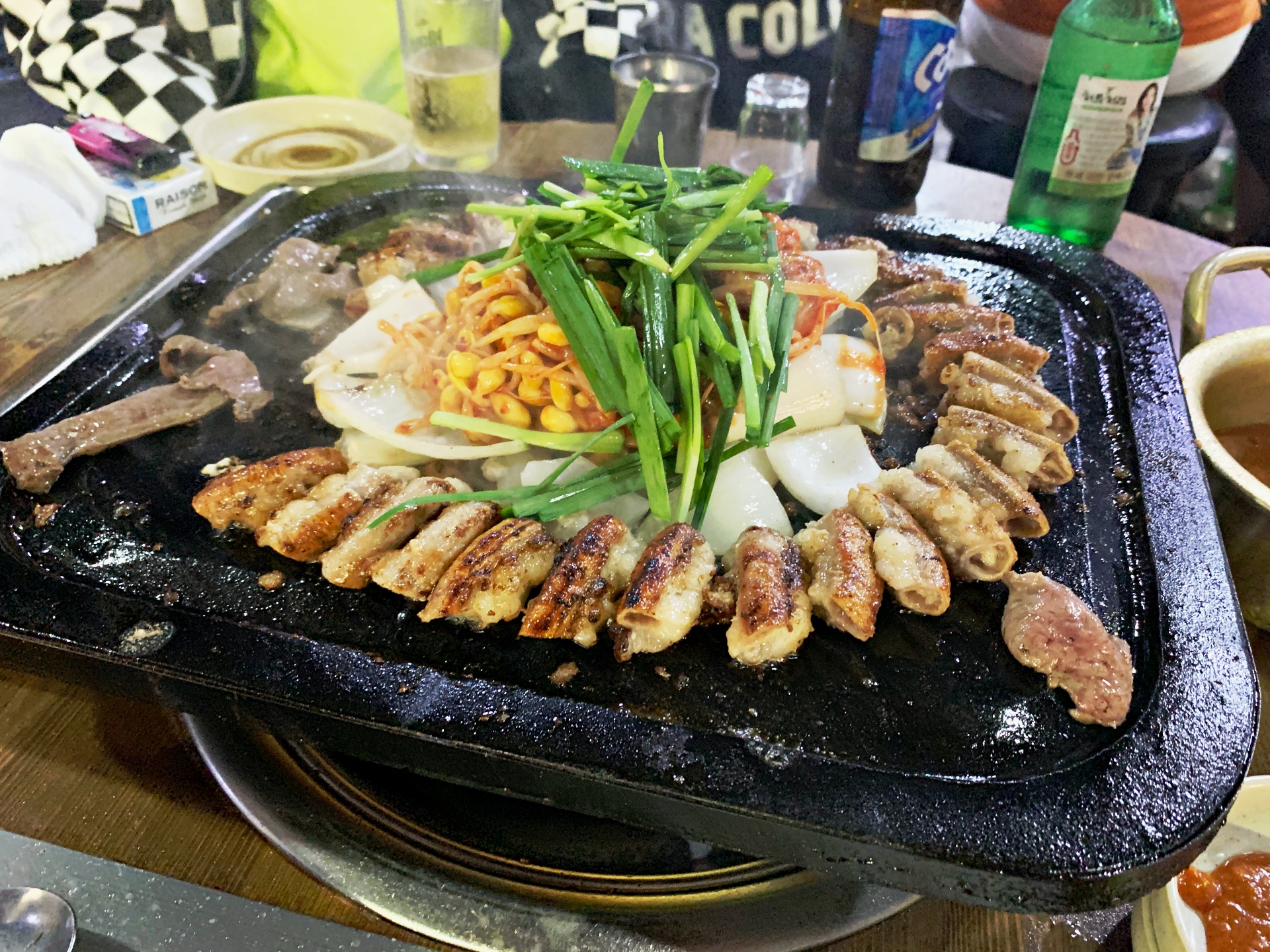 초벌을 진행하고 제공되기 때문에 조금만 더 익히면 금방 먹을 수 있어요. 염통을 뒤집어 주시고, 부추와 콩나물을 위에 올려주십니다. 지글지글 양파가 구워지는 소리와 곱창이 구워지는 소리가 마음에 들어요!