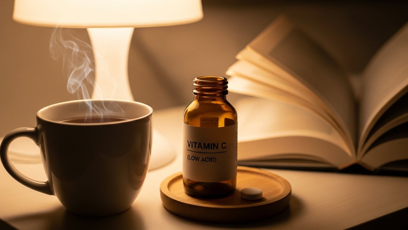 🌙 저녁 — 따뜻한 보리차 + 비타민C 저자극 제품