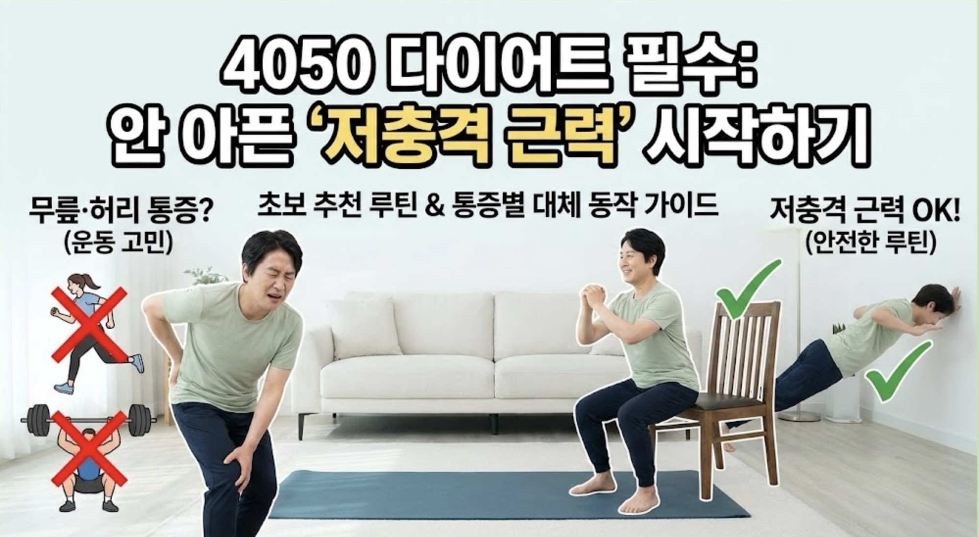 일상 2026-02-17 00:59:00 무릎·허리 불편해도 가능한 다이어트 근력운동: 초보 40~50대 저충격 루틴 가이드 운동 초보 · 남녀 공통 · 40~50대 · 다이어트 중심 · 무릎/허리 저충격 근력 ..